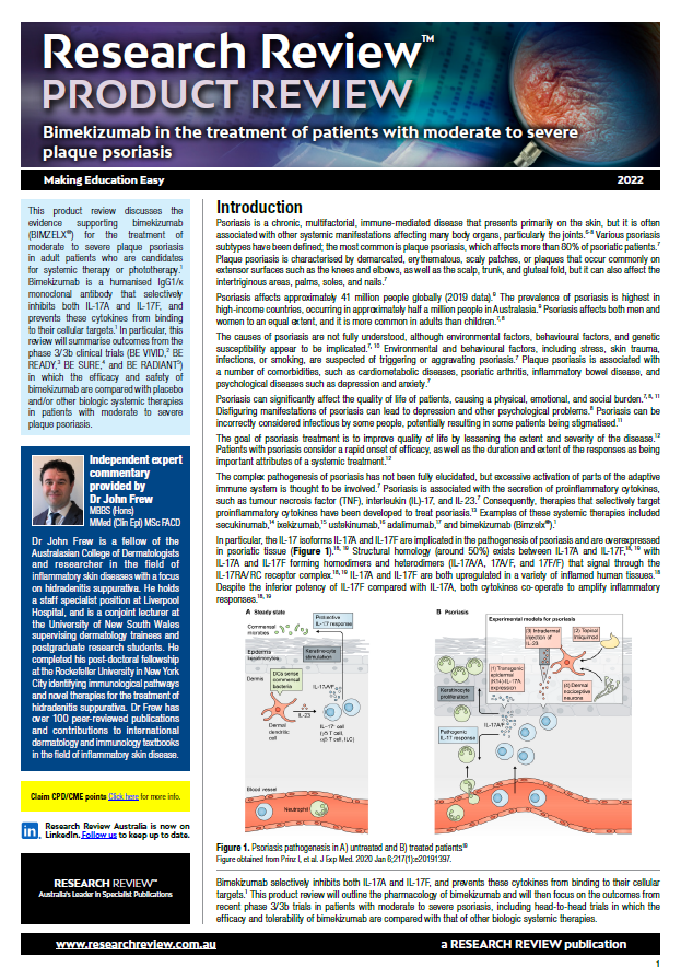 As part of our ongoing series focussing on new registrations in Australia, we have added a product review of Bimekizumab in the treatment of patients with moderate to severe plaque psoriasis.