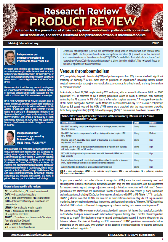This product review focusses on the use of Apixaban for the prevention of stroke and systemic embolism in patients with non-valvular atrial fibrillation, and for the treatment and prevention of venous thromboembolism.