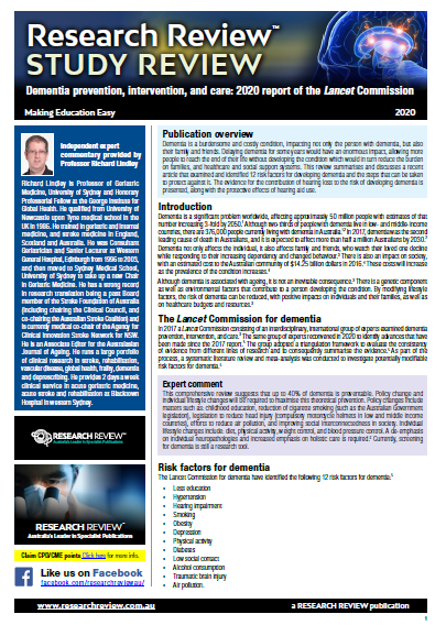 This review summarises 12 risk factors for developing dementia and the steps that can be taken to protect against it. Commentary is provided by Professor Richard Lindley, Professor of Geriatric Medicine, University of Sydney and Honorary Professorial Fellow at the George Institute for Global Health.