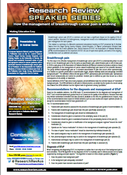 This review is a summary of a recent speaker event held in Sydney titled ‘How the management of breakthrough cancer pain is evolving.’ The presentation included how supportive care fits in with palliative care, clinical features of BTcP, the Association of Palliative Medicine (APM) recommendations for the treatment of BTcP, the use of rapid onset opioids, and some of the ongoing controversies such as addiction and abuse.