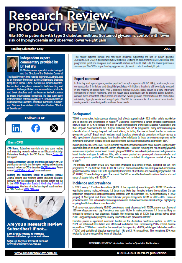 As part of our series focussing on medicines available in Australia, we have added a product review which explores clinical and real-world evidence supporting the use of insulin glargine 300 U/mL (Gla-300) in people with type 2 diabetes. Drawing on data from the EDITION clinical trial programme, post-hoc analyses, and real-world studies such as DELIVER-G, the review provides a summary of Gla-300’s impact on hypoglycaemia, glycaemic control, and weight gain.