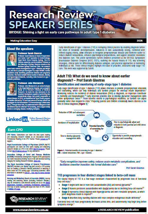 This Speaker Series presented by Professor Sarah Glastras and Professor John Wentworth synthesises current evidence presented at the BR1DGE Symposium (Australasian Diabetes Congress [ADC] 2025), outlining the natural history of T1D, key screening strategies, clinical tools for differentiating diabetes subtypes, and practical approaches to monitoring individuals at risk.