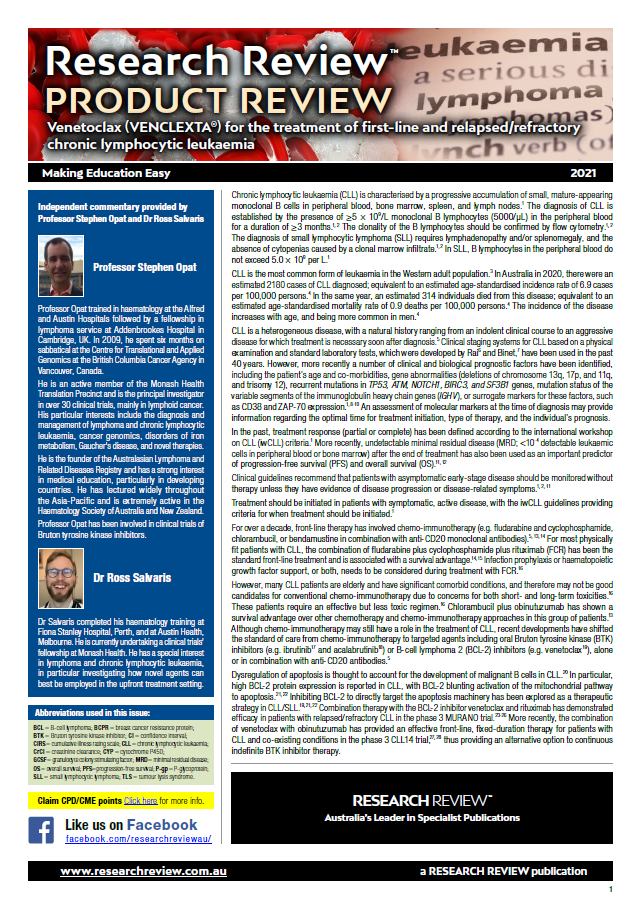 As part of our ongoing series focussing on new registrations in Australia, we have added a product review of the use of Venetoclax for the treatment of first-line and relapsed/refractory chronic lymphocytic leukaemia.