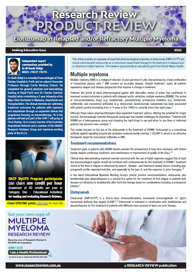 This review discusses current treatment recommendations, pharmacological properties, mechanism of action and major studies featuring Elotuzumab. It also provides commentary and recommendations from Dr Hasib Sidiqi, a consultant haematologist at Fiona Stanley Hospital in Perth and an adjunct Associate Professor through Curtin Medical School.