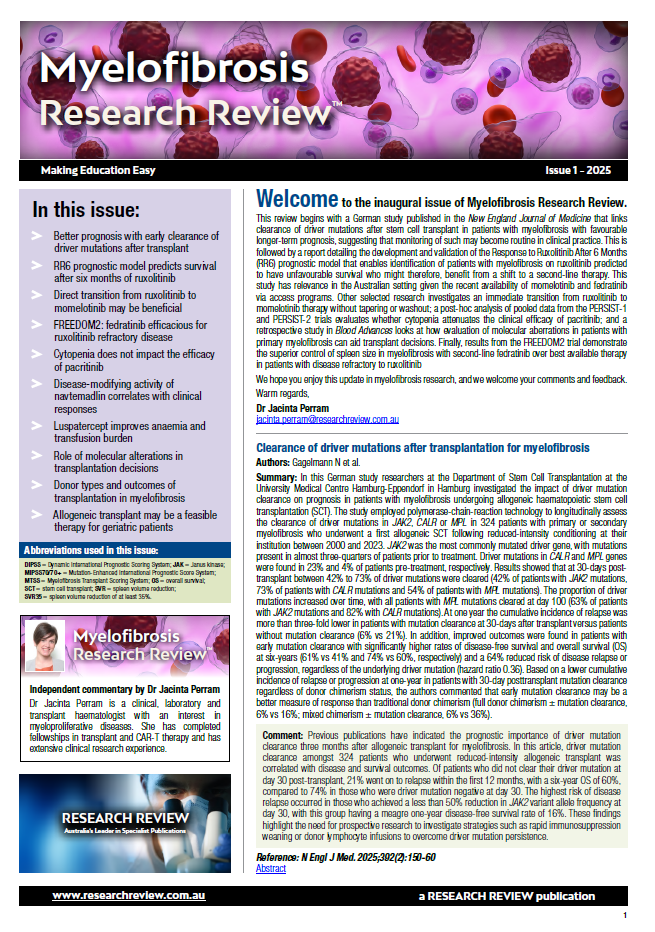 Dr Jacinta Perram, a haematologist from NSW. The Review covers topics such as allogeneic hematopoietic cell transplantation, safety and efficacy of new and existing treatments, driver mutations and many other relevant topics.