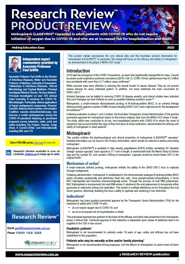 This review discusses pharmacological properties, mechanism of action and major studies featuring Molnupiravir. It also provides commentary and recommendations from Associate Professor Paul Griffin, Director of Infectious Diseases, Mater and Associate Professor of Medicine, University of Queensland.