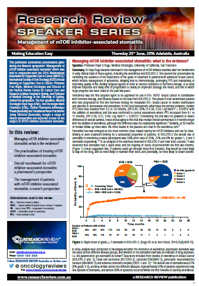 This review is a summary of a recent speaker event in Adelaide at the MASCC meeting. The speakers included Medical Oncologist Hope Rugo (USA), Oral Oncologist Mark Chambers (USA), Clinical Pharmacist Abhimanyu Phatak (Australia) and Transitional Nurse Practitioner Jenny Gilchrist (Australia).