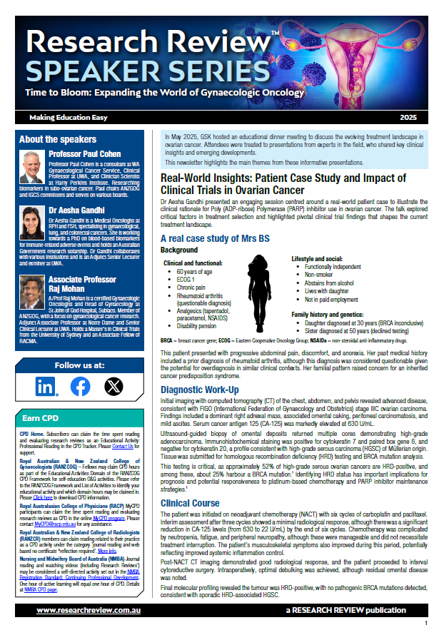 We’ve added a new summary of a dinner meeting discussing the evolving treatment landscape in ovarian cancer. The speakers included Professor Paul Cohen as Chair, Dr Aesha Gandhi who presented a session centred around a real-world patient case to illustrate the clinical rationale for PARP inhibitor use in ovarian cancer and Associate Professor Raj Mohan who provided an overview of pivotal clinical trials evaluating the role of primary debulking surgery in the management of advanced ovarian cancer.