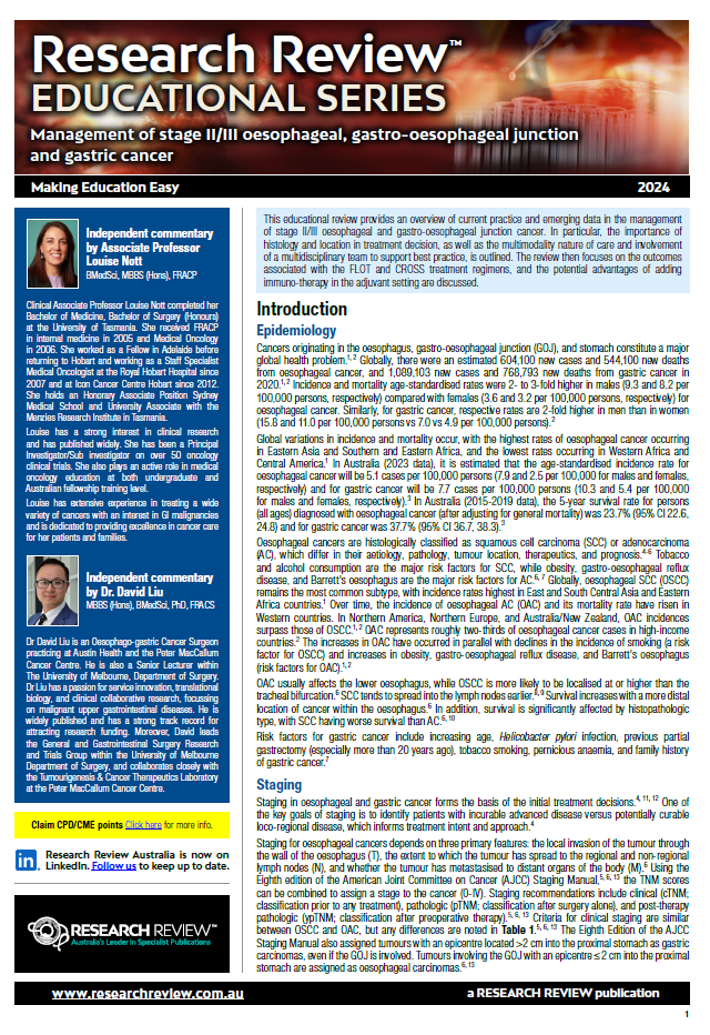 The review covers epidemiology, staging, management of stage II/III disease, treatment options, a focus on adjuvant nivolumab following chemoradiation therapy, and ongoing phase 3 trials with immunotherapy as adjunct therapy. It also includes guiding commentary from Associate Professor Louise Nott and Dr David Liu.