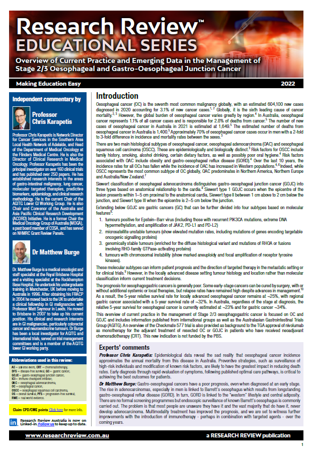 We are delighted to add our latest Educational Series which gives an overview of current practice in the management of Stage 2/3 oesophagogastric cancer focussing on oesophageal cancer (OC) and gastro-oesophageal junction cancer (GOJC) as well as an overview of the Checkmate 577 trial provided as background to the TGA approval of nivolumab as monotherapy for the adjuvant treatment of resected OC or GOJC in patients who have received neoadjuvant chemoradiotherapy.