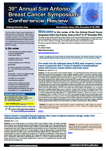 The San Antonio Breast Cancer Symposium is held each year in San Antonio, Texas, about a fortnight or so before Christmas. It is the largest international breast cancer meeting and it aims to mix laboratory research with clinical research. The following were important topics at this symposium. Some of the reports are potentially practice changing.