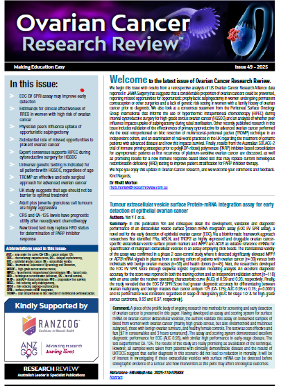 Dr Rhett Morton. The Review covers topics such as epithelial ovarian cancer, recurrent ovarian cancer, oral contraceptives, chemotherapy, molecular markers.