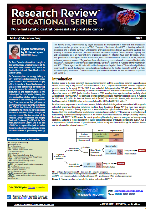The review includes guiding commentary from Dr Renu Eapen, a Consultant Urologist at the Peter MacCallum Cancer Centre and the Austin Hospital and Olivia Newton-John Cancer Centre.