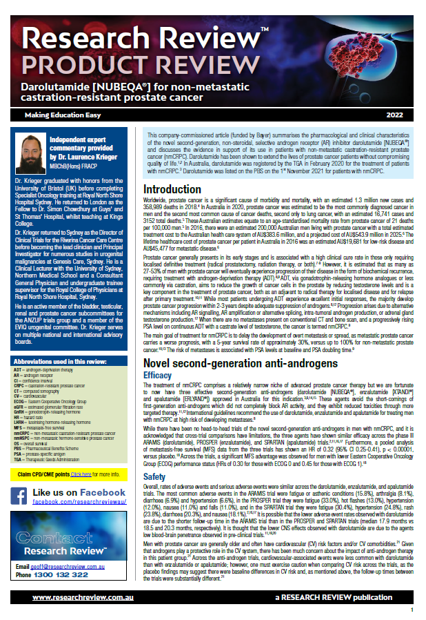 As part of our ongoing series focussing on new registrations in Australia, we have added a product review of the use of Apalutamide in patients with non-metastatic castration-resistant prostate cancer or metastatic castration-sensitive prostate cancer.