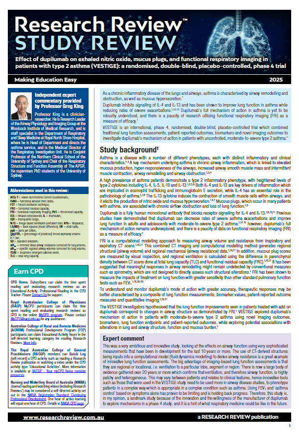 Independent commentary for the review has been provided by Professor Greg King, Research Leader of the Airway Physiology and Imaging Group at the Woolcock Institute of Medical Research, staff specialist in the Department of Respiratory and Sleep Medicine at Royal North Shore Hospital, Medical Director of the Respiratory Investigation Unit and Conjoint Professor of the Northern Clinical School of the University of Sydney.