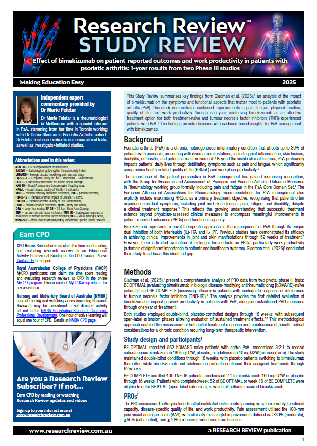 Independent commentary for the review has been provided by Dr Marie Feletar, a rheumatologist in Melbourne with a special interest in PsA.