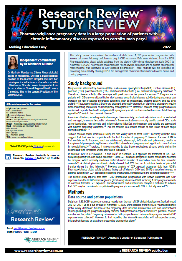 This review summarises the analysis of data from 1,392 prospective pregnancies with independent commentary provided by Dr Maninder Mundae, a clinical rheumatologist based in Melbourne.