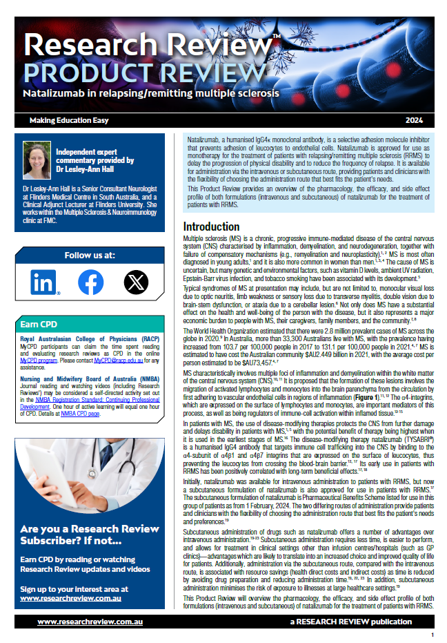 As part of our series focussing on medicines in Australia, we have added a product review of the use of natalizumab in relapsing/remitting multiple sclerosis.
