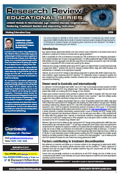 This educational review examines current unmet needs, reasons for discontinuation, reducing treatment burden and provides commentary from Associate Professor Andrew Chang, a vitreoretinal surgeon and ophthalmologist who is Clinical Associate Professor at the University of Sydney and Head of the Retinal Unit at the Sydney Eye Hospital.
