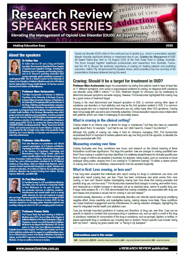 This review summarises presentations by Dr Esther Han, Professor Marc Auriacombe, Professor John Marsden, Dr Paul MacCartney and Professor Prasun Datta from the ‘Elevating the Management of OUD: An Expert Forum’ held on the 28 August 2025 at the Park Royal Hotel in Sydney, Australia to discuss the particular importance of craving for treating patients and predicting outcomes.