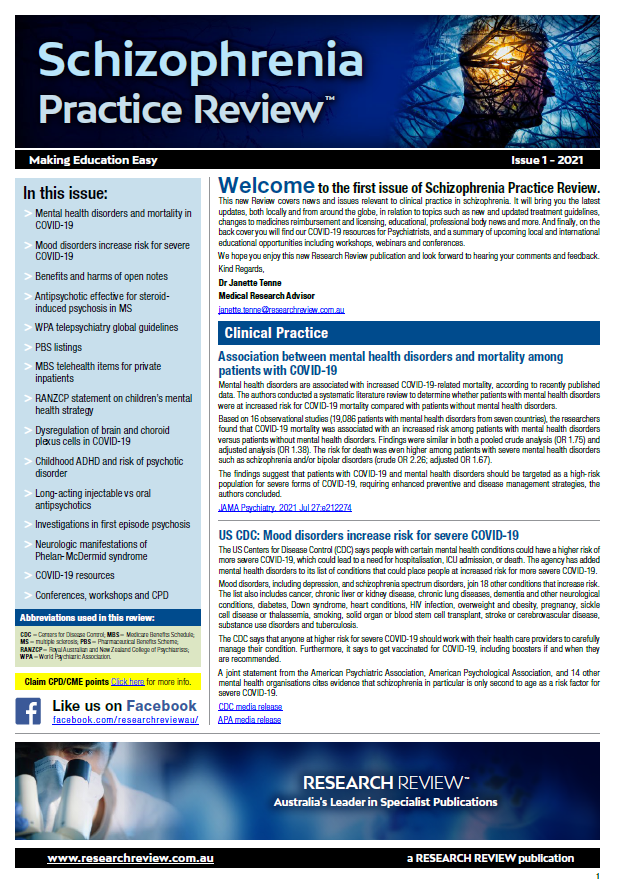Professors Dan Siskind and Malcolm Hopwood. The Review covers topics such as neuropsychiatry, schizophrenia, antipsychotics depression, ADHD and SSRI's.