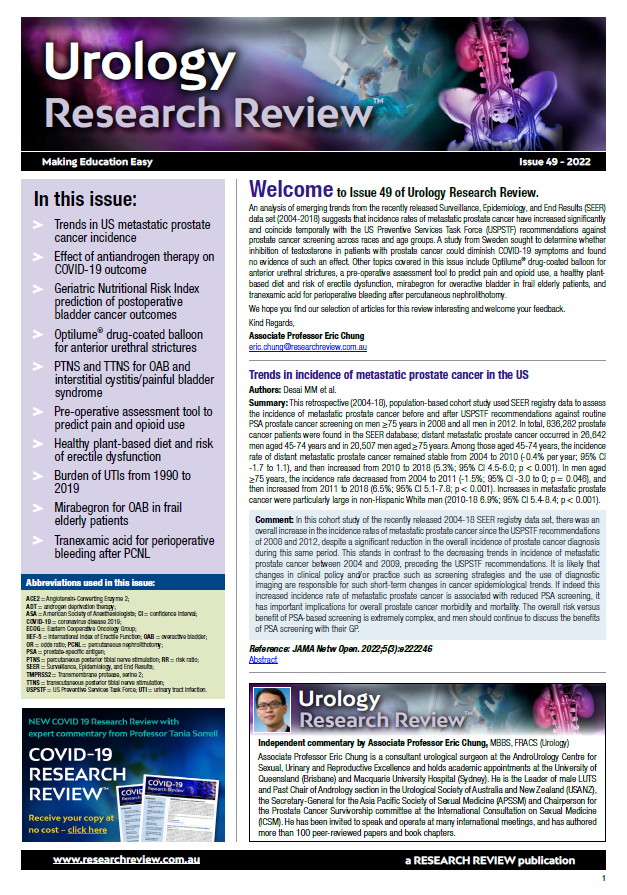 This Review features key medical articles from global urology journals with commentary from Professor Eric Chung. The Review covers topics such as genitourinary disorders, endourology, laparoscopy, urogynaecology, benign prostatic hyperplasia, kidney stones, bladder cancer, erectile dysfunction, and vasectomy reversal.