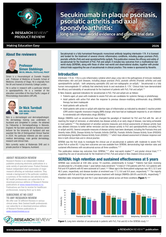 Secukinumab is a fully humanised therapeutic monoclonal antibody targeting interleukin-17A. It is licensed and funded for the treatment of several chronic inflammatory conditions, including plaque psoriasis (PsO), psoriatic arthritis (PsA) and axial spondyloarthritis (axSpA). This publication reviews the efficacy and safety of secukinumab for the treatment of PsO, PsA and axSpA. It includes key outcomes from a multinational real world study (SERENA), along with those of other real-world and observational studies, together with pivotal clinical trials supporting the use of secukinumab in clinical practice.