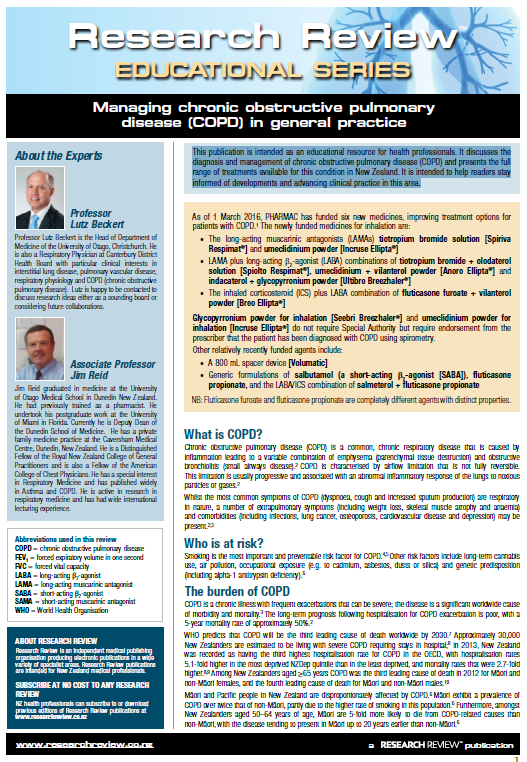 This publication is intended as an educational resource for health professionals. It discusses the diagnosis and management of chronic obstructive pulmonary disease (COPD) and presents the full range of treatments available for this condition in New Zealand. It is intended to help readers stay informed of developments and advancing clinical practice in this area.