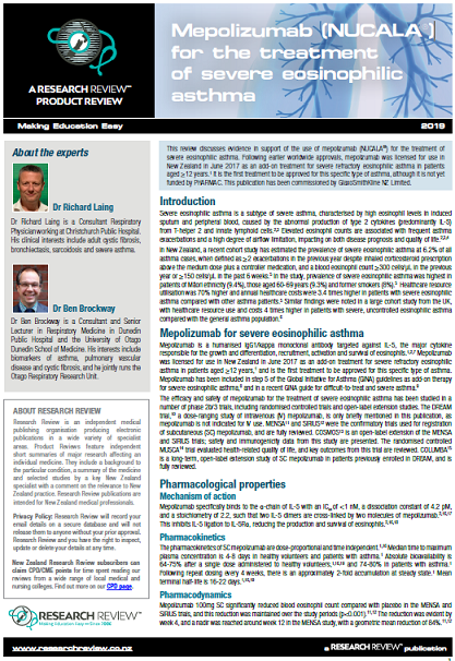 This review discusses evidence in support of the use of mepolizumab (NUCALA®) for the treatment of severe eosinophilic asthma. Following earlier worldwide approvals, mepolizumab was licensed for use in New Zealand in June 2017 as an add-on treatment for severe refractory eosinophilic asthma in patients aged ≥12 years.1 It is the first treatment to be approved for this specific type of asthma, although it is not yet funded by PHARMAC. This publication has been commissioned by GlaxoSmithKline NZ Limited.