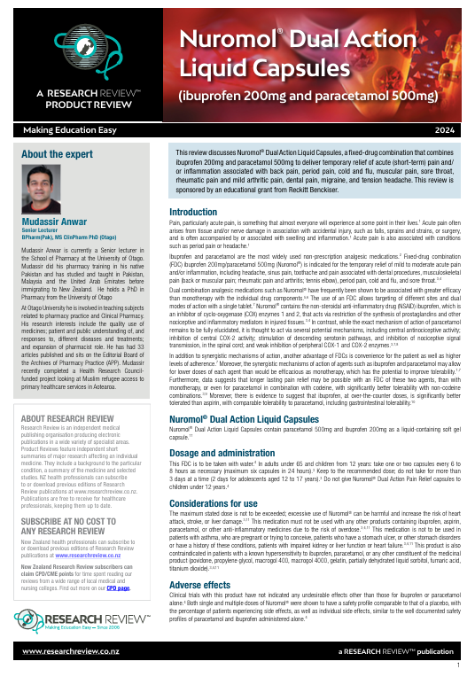 This review discusses Nuromol® Dual Action Liquid Capsules, a fixed-drug combination that combines ibuprofen 200mg and paracetamol 500mg to deliver temporary relief of acute (short-term) pain and/ or inflammation associated with back pain, period pain, cold and flu, muscular pain, sore throat, rheumatic pain and mild arthritic pain, dental pain, migraine, and tension headache. This review is sponsored by an educational grant from Reckitt Benckiser.