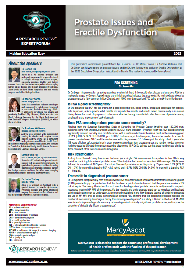 Dr Simon van Rij who spoke on prostate issues, and by Dr John Tuckey who spoke on Erectile Dysfunction at the 2023 Goodfellow Symposium in Auckland in March. This review is sponsored by MercyAscot.