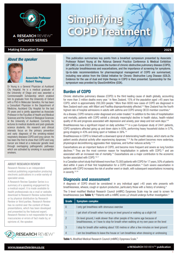 This publication summarises key points from a breakfast symposium presented by Associate Professor Robert Young at the Rotorua General Practice Conference & Medical Exhibition (GP CME) in June 2023. It discusses the burden of chronic obstructive pulmonary disease (COPD), in particular breathlessness and exacerbations, and the importance of screening for symptoms. Up-to-date recommendations for pharmacological management of COPD are summarised, including new advice from the Global Initiative for Chronic Obstructive Lung Disease (GOLD). Evidence for the use of dual and triple therapy in COPD is then presented. Sponsorship for the symposium was provided by GlaxoSmithKline (GSK).