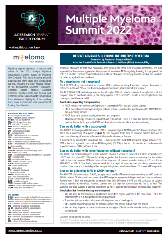Myeloma experts convened in person and online for the 2022 Multiple Myeloma Queenstown Summit, hosted by Myeloma New Zealand. This year’s meeting included presentations from local and international experts, including the Chief Medical Officer of the International Myeloma Foundation, Professor Joseph Mikhael, Assistant Professor Jonathan Keats from Arizona, and Professor Simon Harrison and Dr Simon Gibbs from Melbourne. Highlights of the meeting have been summarised with unconditional funding from Novartis.