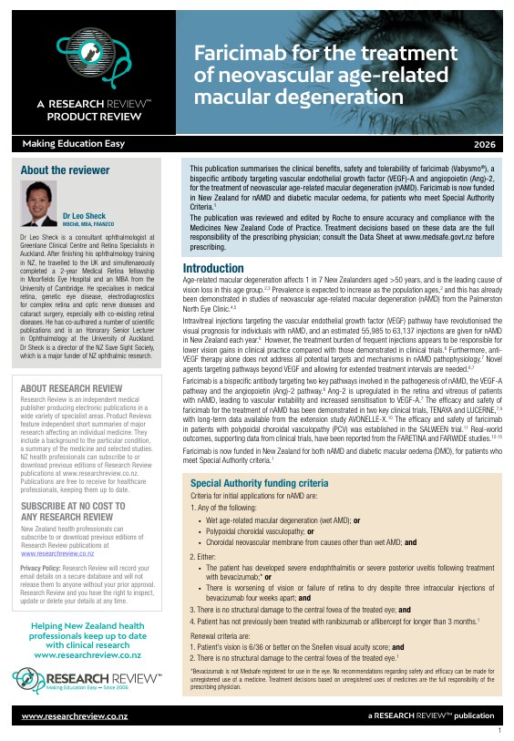 This publication summarises the clinical benefits, safety and tolerability of faricimab (Vabysmo®), a bispecific antibody targeting vascular endothelial growth factor (VEGF)-A and angiopoietin (Ang)-2, for the treatment of neovascular age-related macular degeneration (nAMD). Faricimab is now funded in New Zealand for nAMD and diabetic macular oedema, for patients who meet Special Authority Criteria.