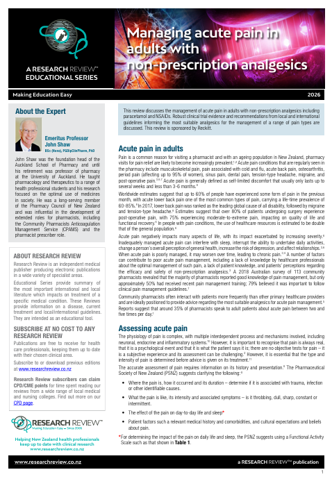 This review discusses the management of acute pain in adults with non-prescription analgesics including paracetamol and NSAIDs. Robust clinical trial evidence and recommendations from local and international guidelines informing the most suitable analgesics for the management of a range of pain types are discussed.