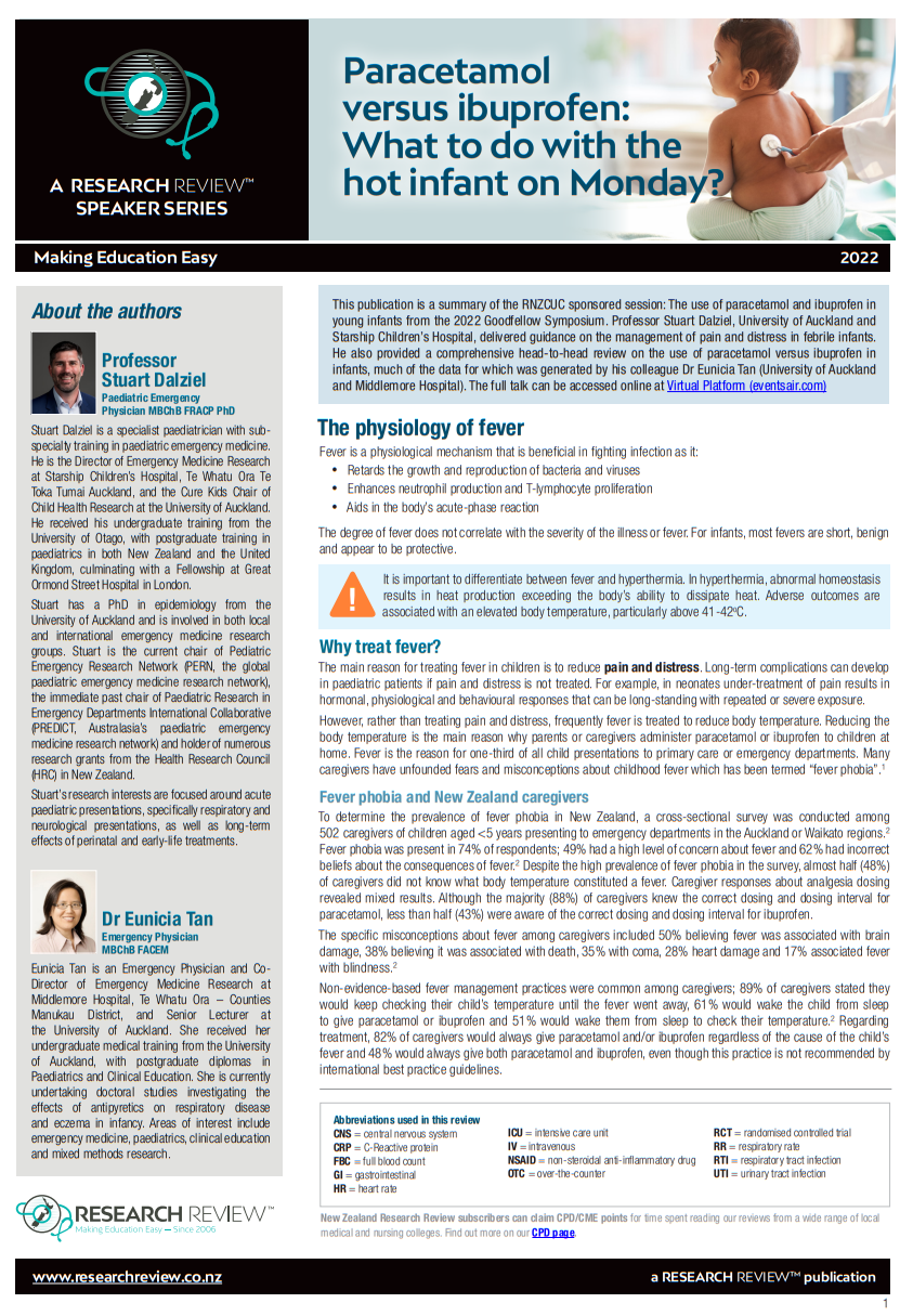 This publication is a summary of the RNZCUC sponsored session: The use of paracetamol and ibuprofen in young infants from the 2022 Goodfellow Symposium. Professor Stuart Dalziel, University of Auckland and Starship Children’s Hospital, delivered guidance on the management of pain and distress in febrile infants. He also provided a comprehensive head-to-head review on the use of paracetamol versus ibuprofen in infants, much of the data for which was generated by his colleague Dr Eunicia Tan (University of Auckland and Middlemore Hospital). The full talk can be accessed online at Virtual Platform (eventsair.com)